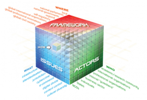 - L’axe QUI du cube se concentre sur les principaux ACTEURS (États, organisations internationales, société civile, secteur privé). C’est le côté multipartite de l’approche.